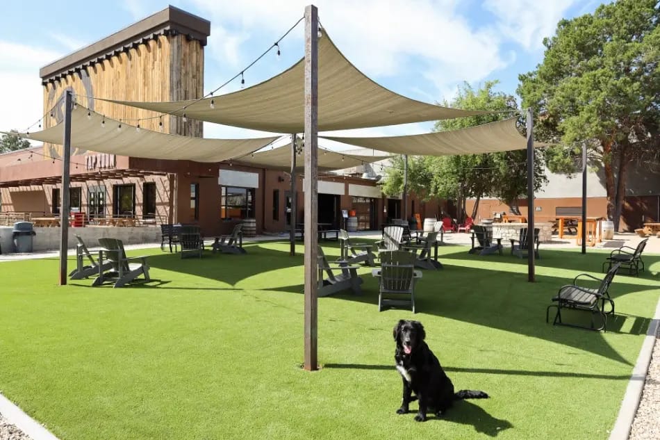 Massive Beer Garden: The 11,000-square-foot outdoor space isn't just a patio; it’s a fully fenced-in lawn with SYNLawn artificial turf designed to be durable and clean for kids to run on.